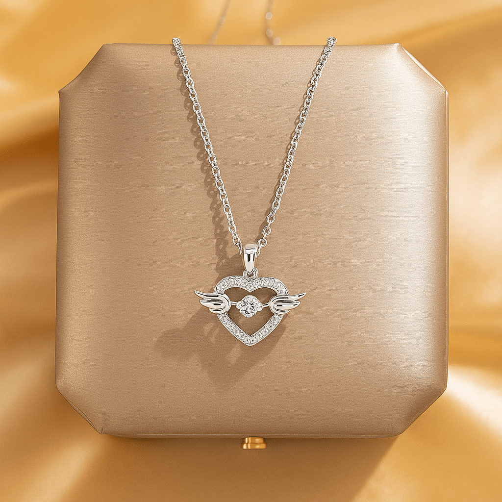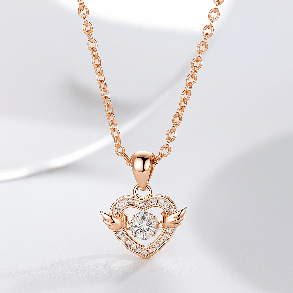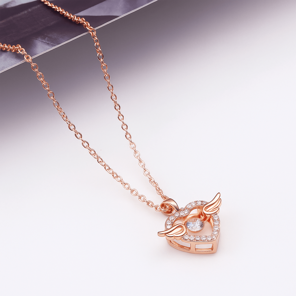 Add a divine touch to your jewelry with the Moving Diamond Zircon Angel Wings Heart Pendant. Crafted with rose gold plating and shimmering zircon crystals, this heart-shaped necklace symbolizes love and protection. Featuring graceful angel wings with a sparkling moving diamond centerpiece, it’s perfect for everyday elegance or special occasions. An ideal gift for birthdays, anniversaries, or festive celebrations.